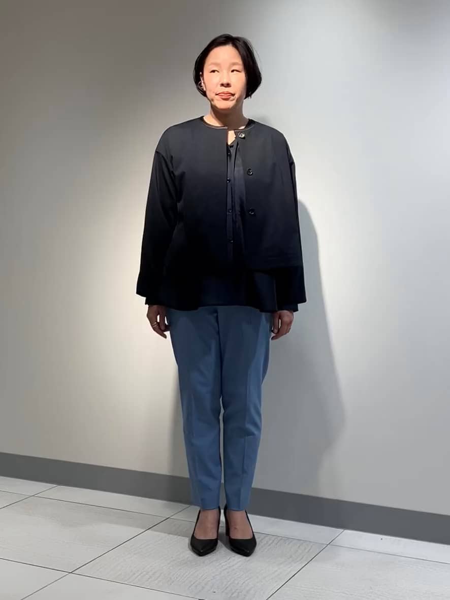 ネイビーのジャケットとブラウスに、あえてトーンの違うブルーのパンツを合わせた、ネイビーグラデーションスタイルです。
