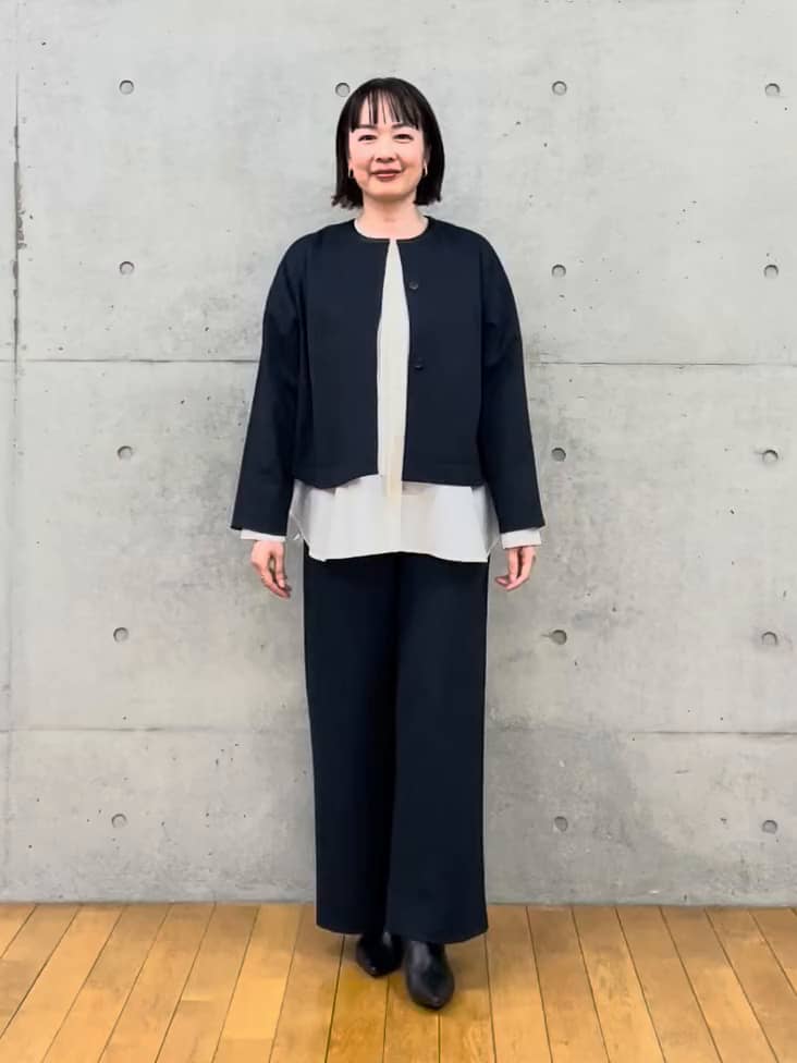 1肩まわりがスッキリ見えるサイズ。驚くほど軽く、襟のサテン地がネイビーに映えて顔まわりを華やかに見せてくれます。