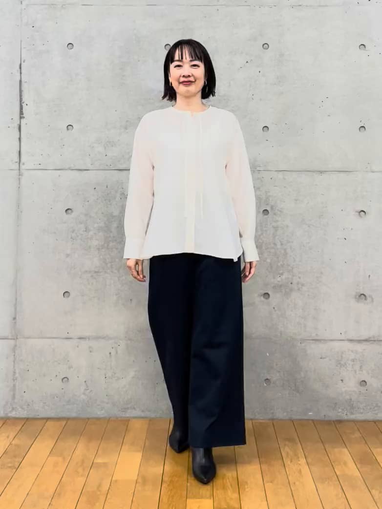 161cmでヒップが隠れる安心の着丈。ヒールを履くことで、ふわっと広がる裾のラインがより高い位置で映え、小顔&脚長効果が際立ちます。