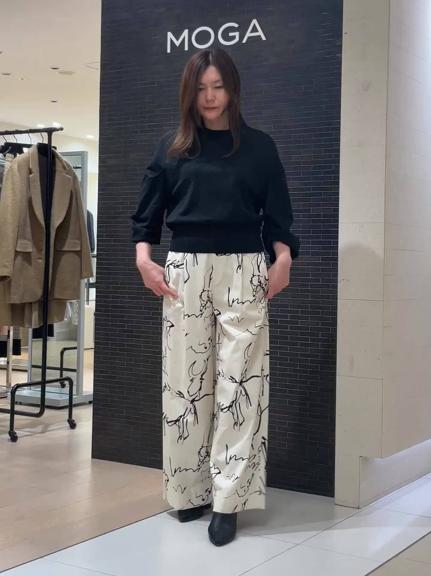 3サイズ着用で、高身長さんでも美しく穿きこなせるフルレングス。柄のインパクトをブラックのニットが程よく引き締めてくれるので、派手すぎず大人っぽい印象で楽しめます。