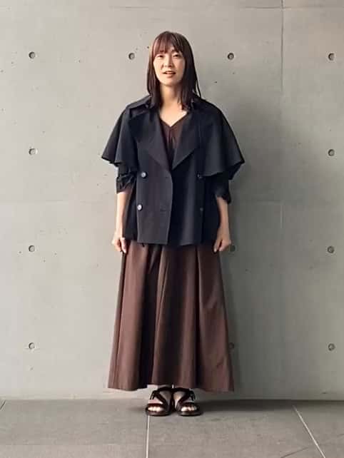 161cmで足元が綺麗に見えるロング丈。落ち着いたブラウンがネイビーのコートと相性抜群です。程よい落ち感のあるシルエットが、コートを羽織った時もスッキリ見せてくれます。