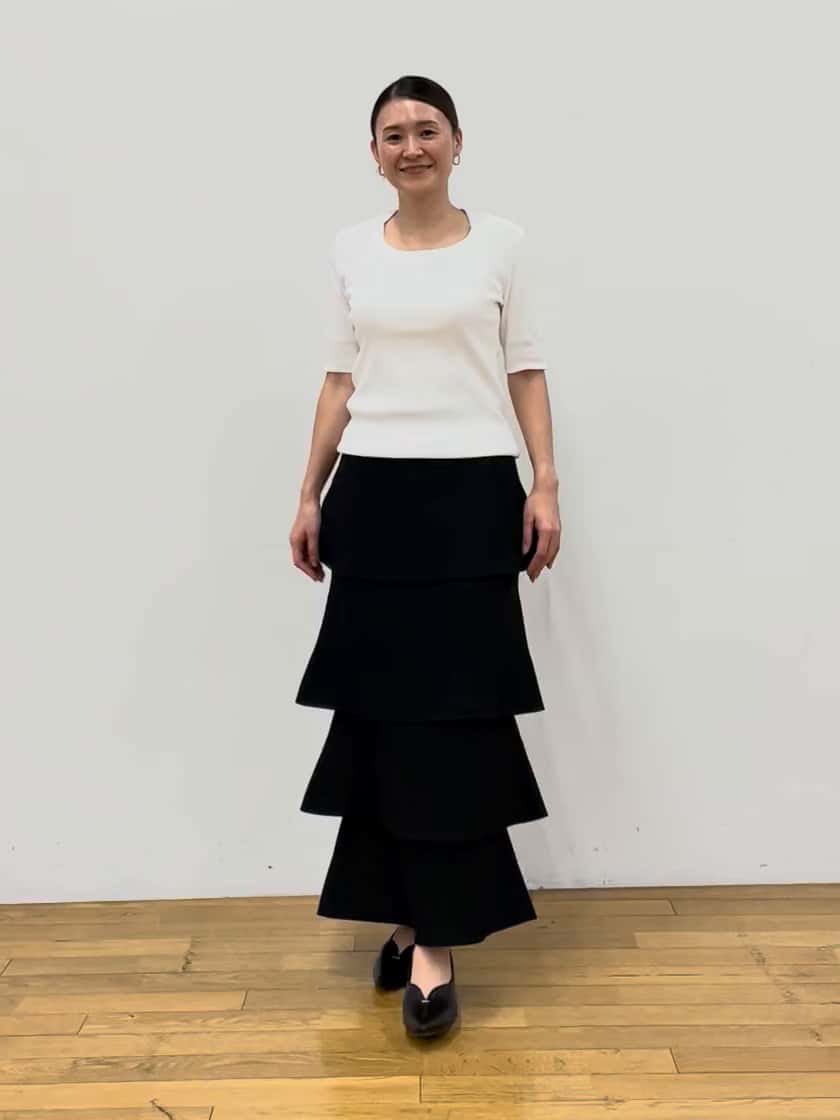 155cmで、丈長めのロング丈です。ヒールを履いた方がバランスは良く見えそうです。腰まわりはスッキリしていて、裾のラッフルが程よく広がるデザインなので、小柄な方でも重たくならず、バランス良く着こなせます。
