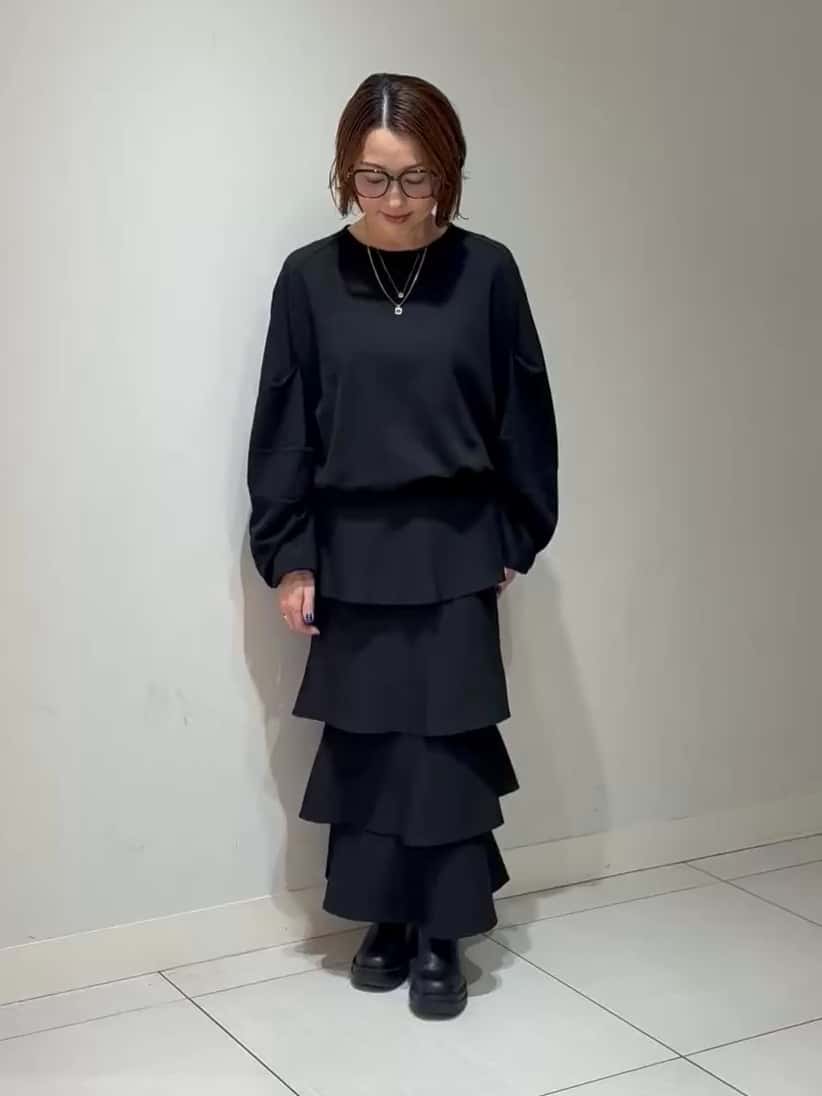 154cmでひと折りして着用しています。ウエストがゴムなので微調整もしやすいです。トップスもスカートも同素材で合わせることで、まるでワンピースのような一体感が生まれ、縦のラインが強調されます。
