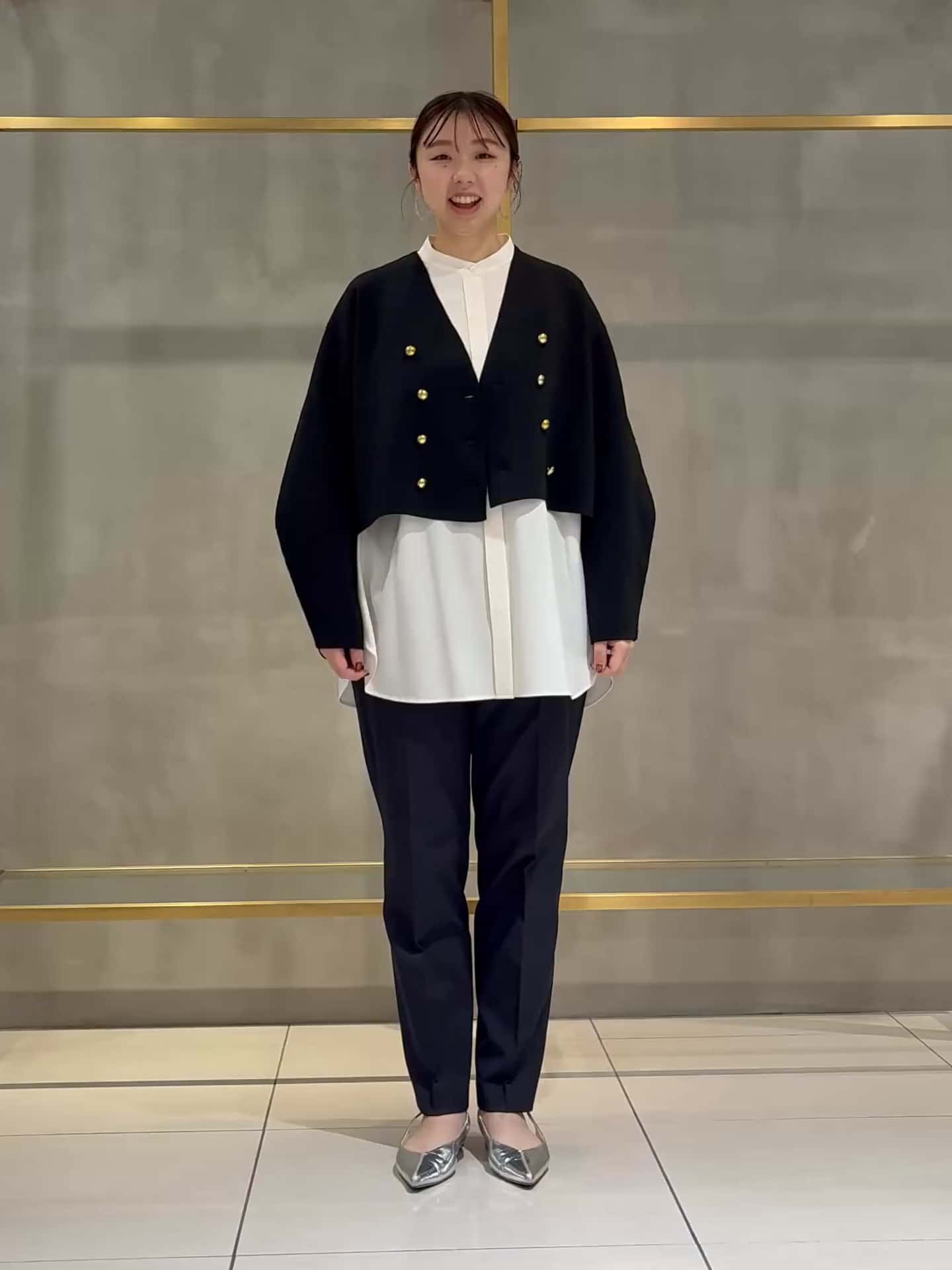 3サイズを着用。164cmで足元まで美しく繋がるフルレングスです。ジャケットとパンツをブラックで統一することで、インナーのオフホワイトがパッと際立ち、視線が上がってスタイルアップが叶います!