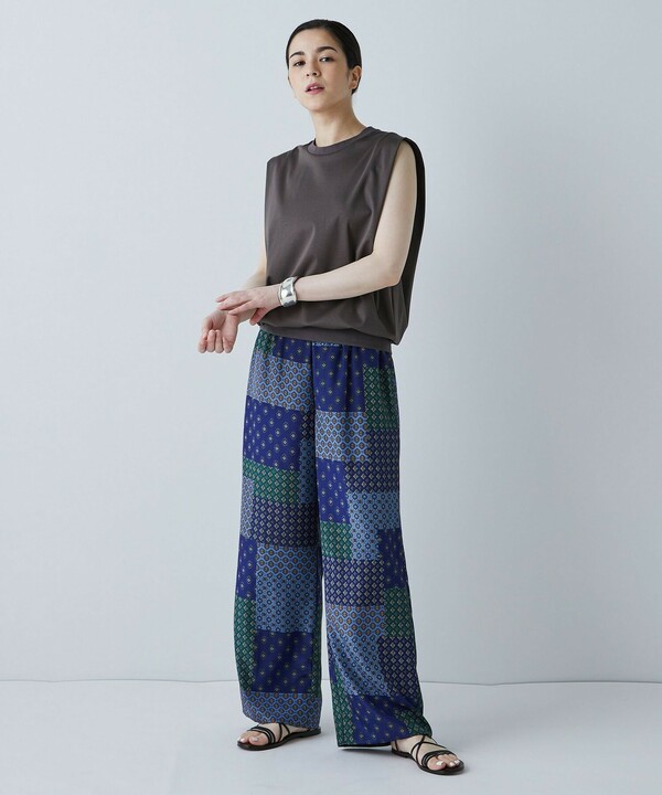 パターンブロックプリントをセットアップでオールインワン風に合わせるとリゾート気分のコーディネートになります。
