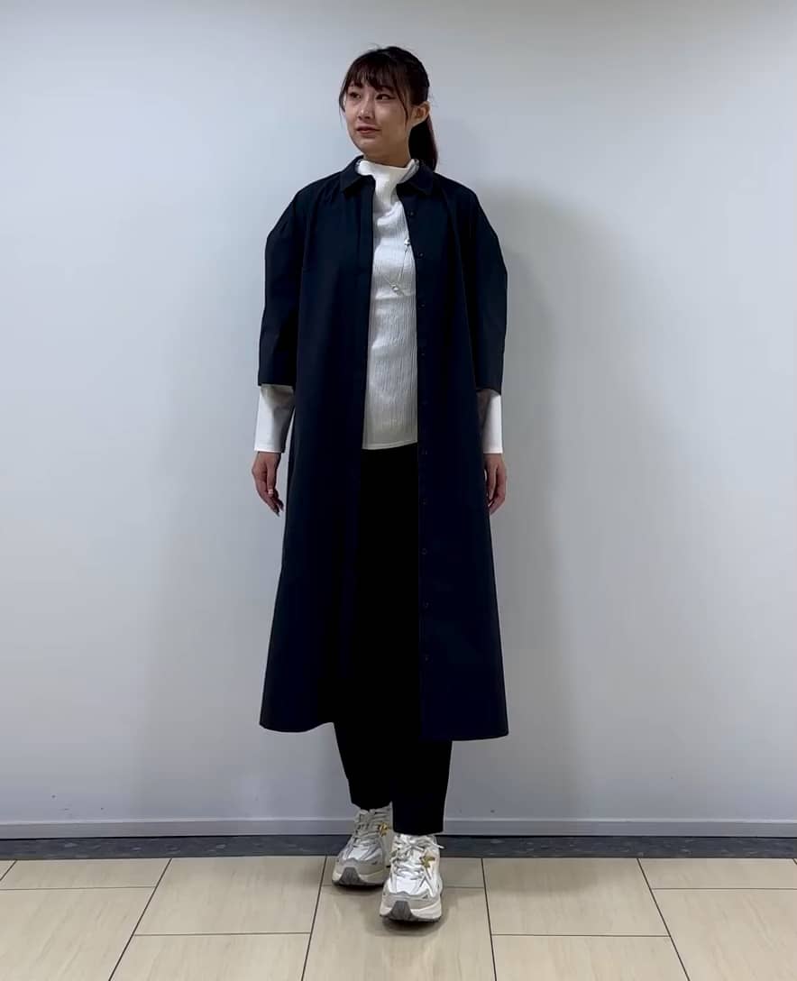 着用感:張り感のある生地感の七分袖ワンピース。168cmで着丈はふくらはぎ丈になるので、細身のテーパードパンツと合わせてみました。