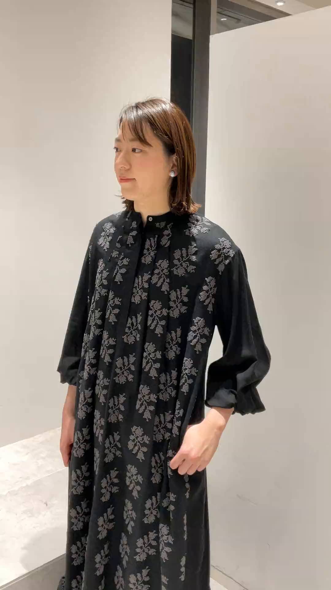 かぶりタイプなのでさくっと着やすい1枚。黒地にグレーの刺繍が施されており、品のあるワンピースです。デニムとスニーカーで普段使いしやすくカジュアルな着こなしに。