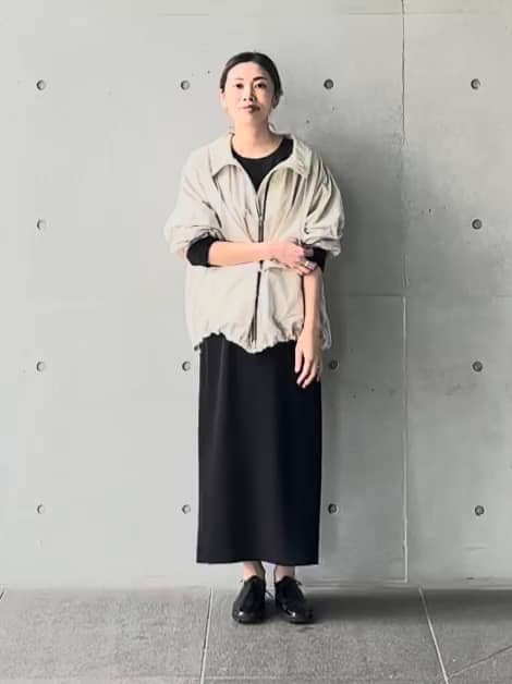 164cmの私が着て、腰回りがスッキリと隠れる使い勝手の良い丈感です。綿ナイロンのナチュラルなしわ感と、驚くほど軽い着心地が魅力。ハイネックに寄せたギャザーが顔周りを華やかに見せてくれます。裾のドロストをギュッと絞って、バルーンシルエットで着こなすのが特におすすめのバランスです!