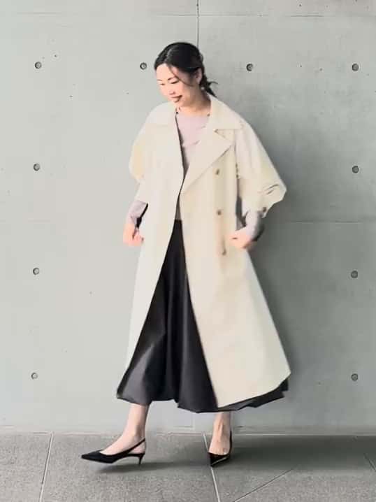 コートを羽織ることで、カットソーのグレージュとバニラの繊細なグラデーションが生まれ、より洗練された印象に。バルーンスカートのボリュームとロングコートの重なりも重たくならず、縦長ラインが強調されたスマートな佇まいになります。