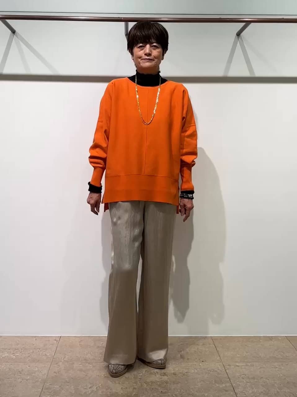 リラックスムードでゆったりしたサイズ感のニット。鮮やかなオレンジはベージュ系のボトムとよく合います。前後ラインがすっきり見えするのでボトムを選びません。