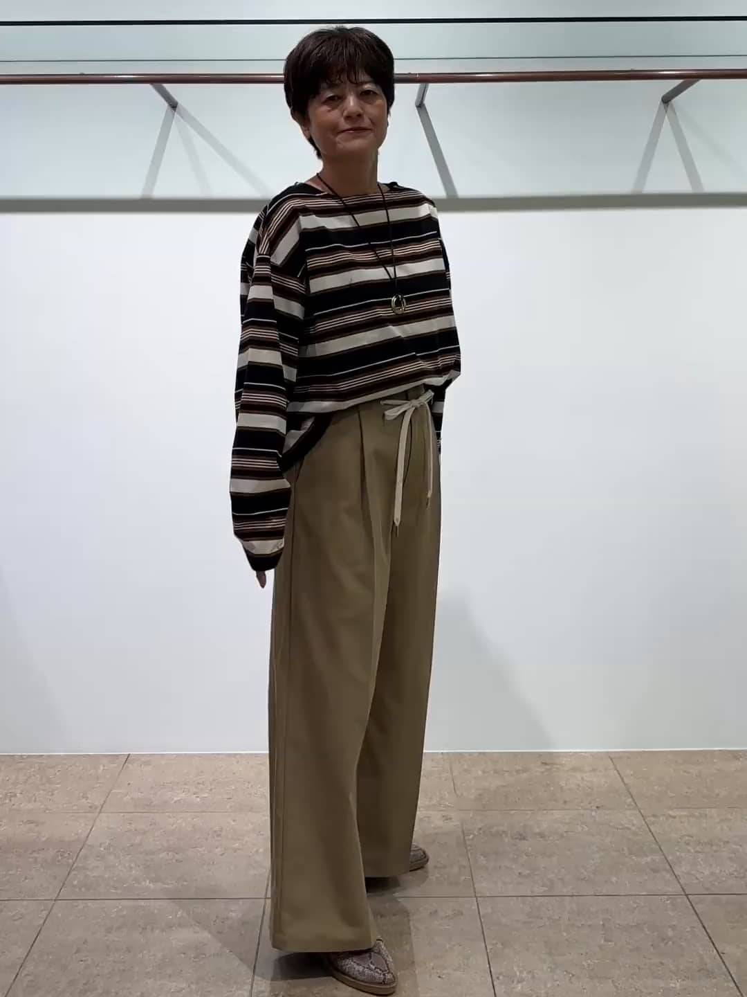 トレンド感のある靴紐のようなテープがポイントのワイドパンツと合わせました。