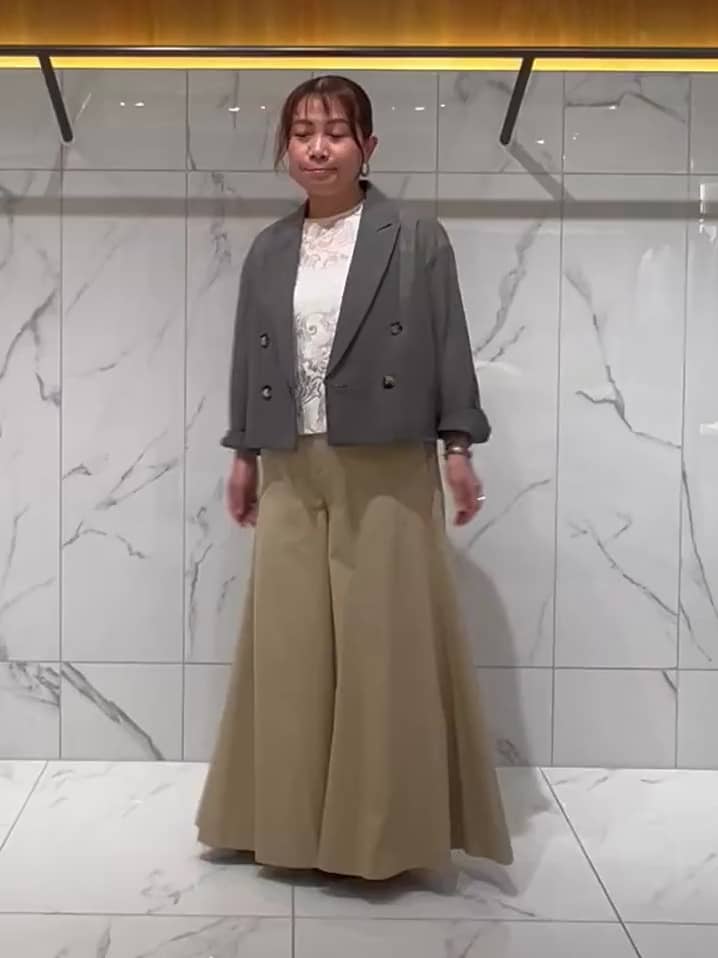 1たっぷりと分量のあるフレアが足元をドラマチックに演出してくれます。裾に向かって広がるシルエットがサイドに奥行きを作ってくれるので、ワイドパンツでものっぺりせず、立体的な脚長ラインが叶います!