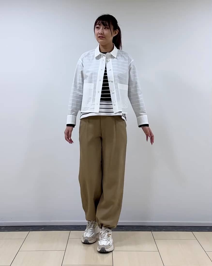 着用感:綿素材で肌に馴染む優しい肌触りの短丈ブラウス。ウエストまでのすっきり着丈なので、一枚でも薄手の羽織としても◎透け感があるので、春の軽やかな着こなしにぴったりのアイテムです。