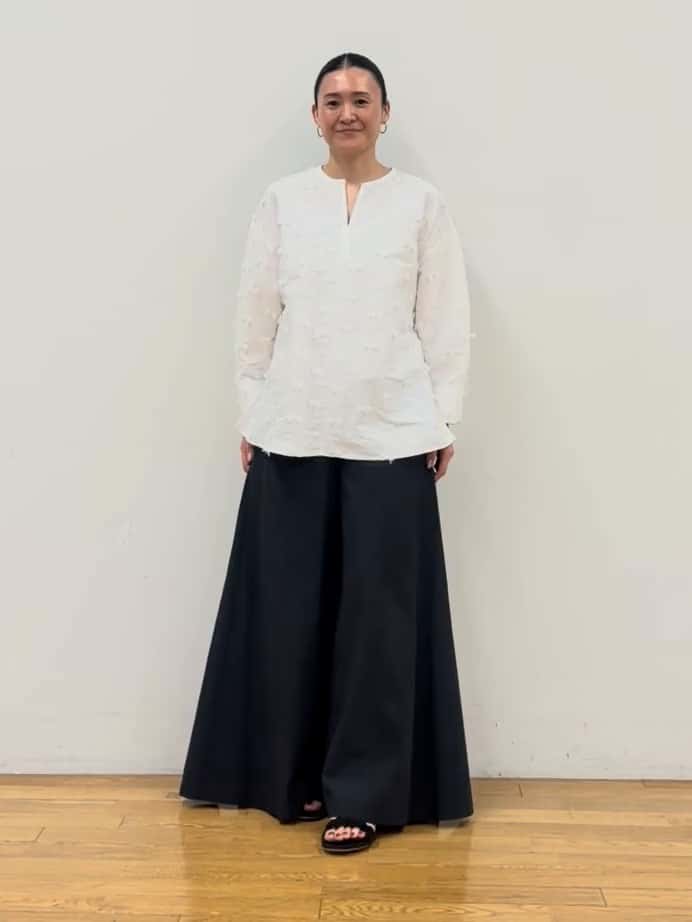 小柄な方が着て、ふんわりとした素材のボリュームを楽しみつつ、後ろのドロストで着丈やシルエットをスッキリと調整できる一枚です。ヒップにかかるくらいの丈感なので、アウトスタイルでもバランス良く決まります。ジャガードの立体感が、白ブラウスにありがちな「無難さ」を払拭し、お顔周りを華やかに見せてくれます。