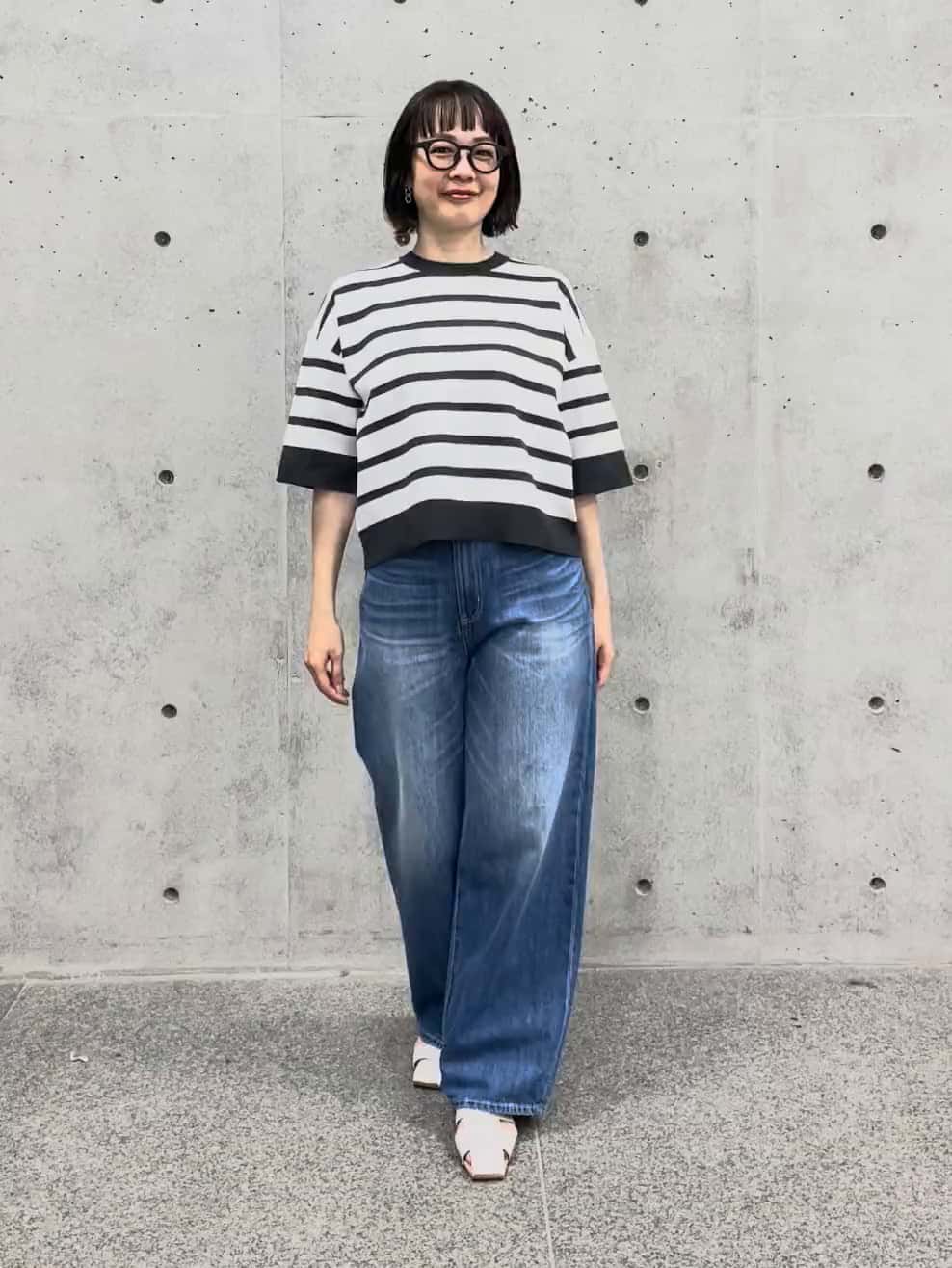 161cmで2サイズを着用し、足元に程よく溜まるボリューム感が今季らしいバランスです。柔らかいデニム素材なので、ワイドでも脚捌きがよく、一日中快適に過ごせます。