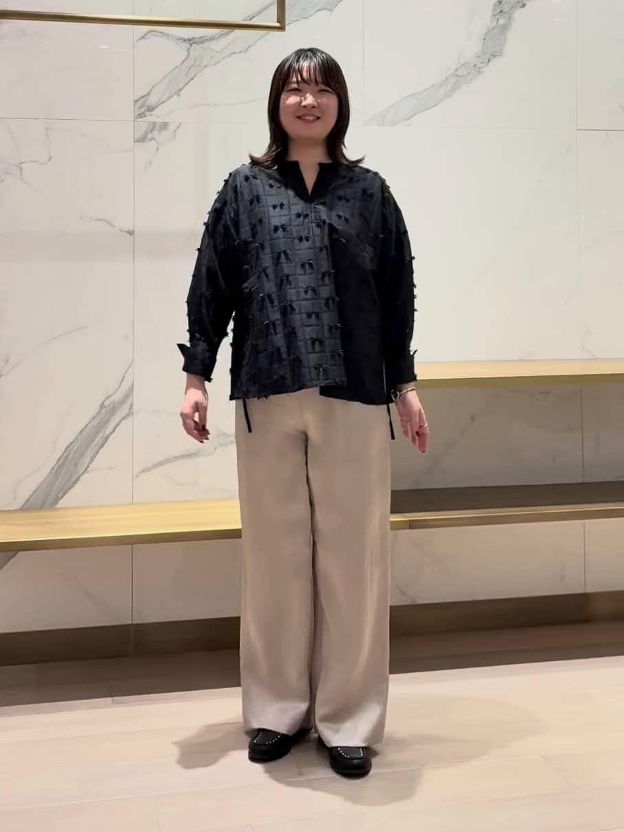 167cmで3サイズを着用しています。しっかりと長さのあるフルレングスで、サテンの流れるようなドレープが脚長効果をさらに強調。トリアセテート混ならではの落ち感のおかげで、ボリュームがありつつも軽やかな佇まいを叶えてくれます。