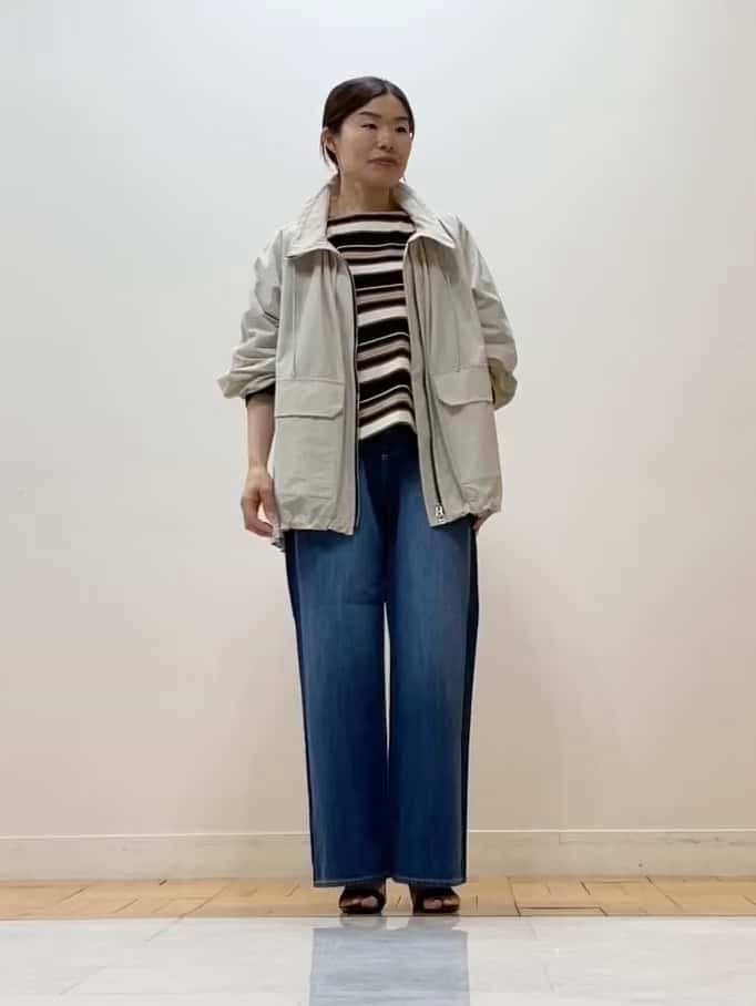 太めのピッチのマルチボーダーが、ブルゾンの衿元からさりげなく覗いてこなれた印象を演出しています。ブラウン系のシックなカラーを選ぶことで、ベージュのブルゾンとの相性も抜群。大人でも取り入れやすいマリン気分が漂います。
