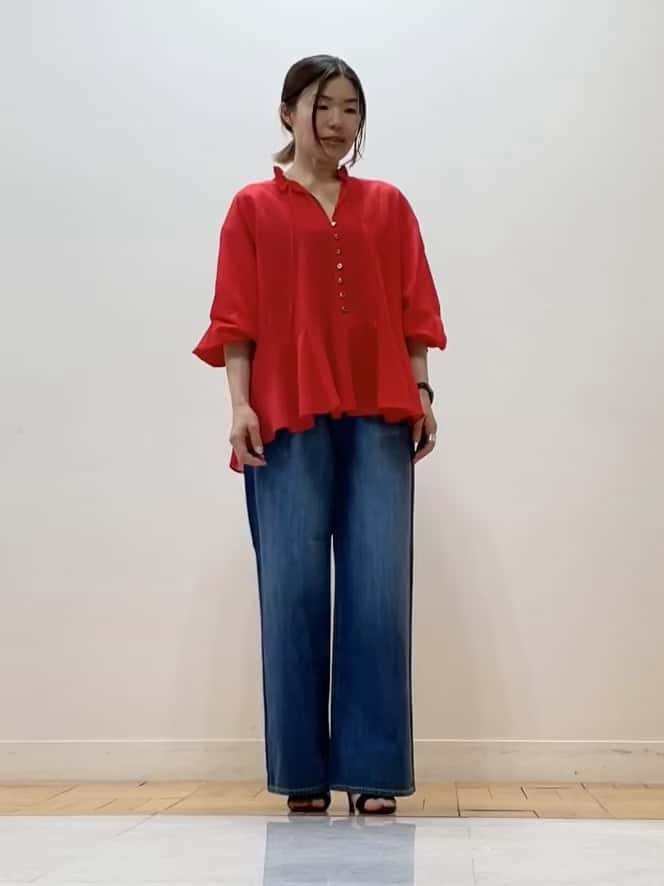 鮮やかなレッドのブラウスに、インディゴブルーのワイドデニムを合わせたコントラストが効いた着こなしです。サイドラインがすっきりとした縦のシルエットを生み出し、ブラウスのAラインとのバランスが絶妙。ヒールを合わせることでカジュアルになりすぎず、大人の余裕ある着こなしに仕上がります。