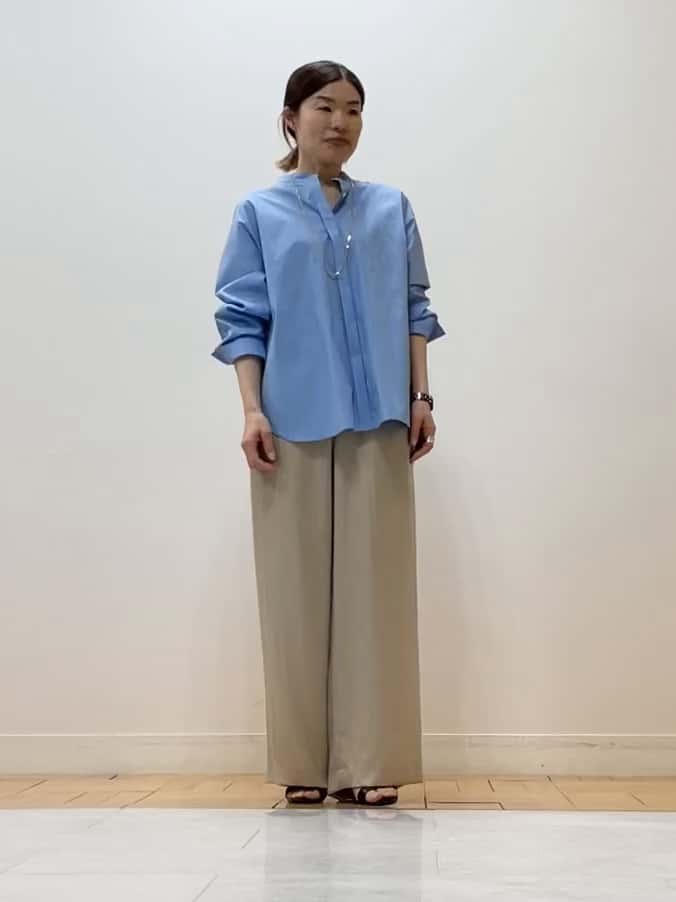サックスブルーとベージュの爽やかなカラーバランスが、春らしい上品なコーディネートに仕上げています。ブラウスのボリューム感とワイドパンツの落ち感が絶妙に調和し、ロングネックレスを添えることでよりスタイリッシュな着こなしに。