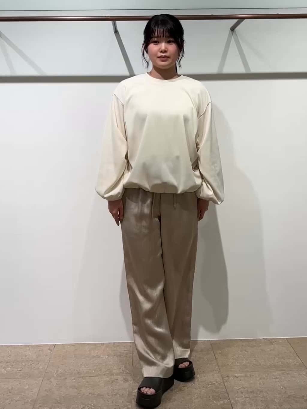 袖の内側と脇下のギャザーが華やかな1枚です。裾バルーンのふくらみのあるフォルムもポイントです。落ち感のあるサテンのパンツと合わせました。62BUB230 2/① オフ リアルバイ62BUP091 2/① ベージュ
