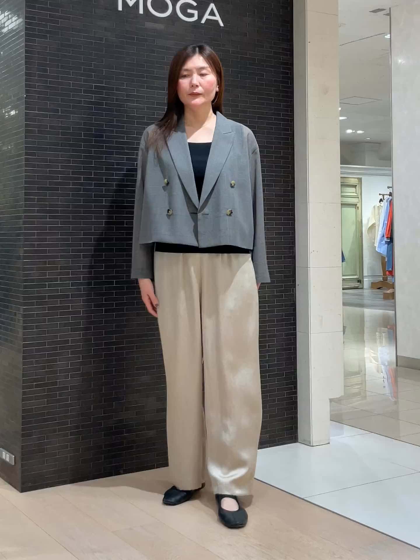 170cmの私が着用して、腰の位置を高く見せてくれるトレンドのクロップド丈です。シアー素材ながらもハリ感があるため、肩のラインが綺麗に立ち、マニッシュなクチュール感のあるシルエットをキープします。袖丈も十分にあり、高身長の方でもバランス良く着こなせる一着です。