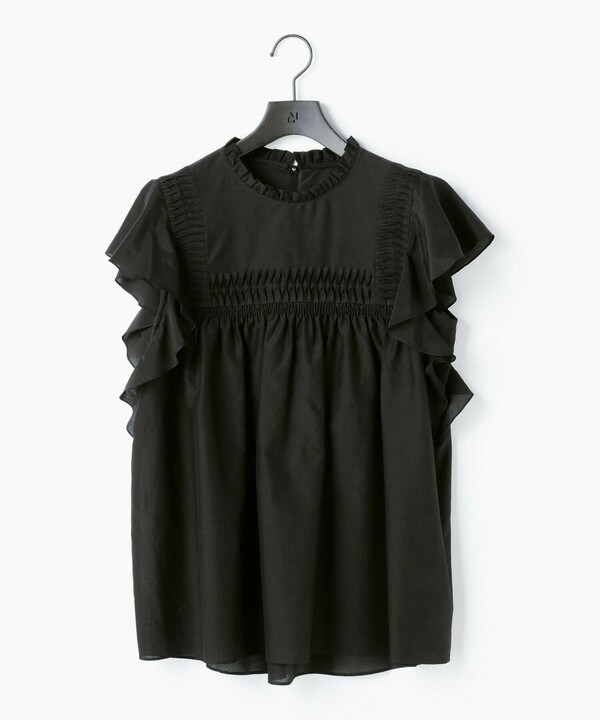 ブラウスは程よい袖丈とフリル分量で二の腕を