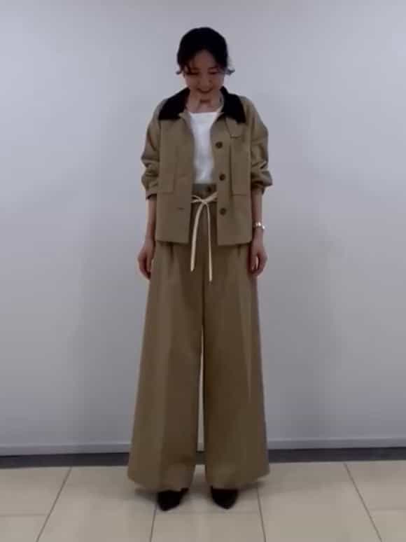 152cmの私が着て、バランスの取りやすいワイドクロップド丈です。袖や身幅にゆとりがありつつも、着丈が短いので重たくなりません。チノ見えするポリエステル素材は驚くほど軽く、肩が凝らない着心地です。