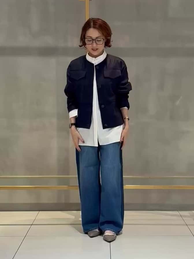 Gジャンをベースに女性らしくアレンジした一枚。1サイズ着用ですが、肩周りや袖幅に程よいゆとりがあり、中にブラウスを重ねてもごわつきません。短めの着丈とポケット下の切り替えが視線を上げてくれるので、羽織るだけでスタイルがすっきり見えるのが魅力です。