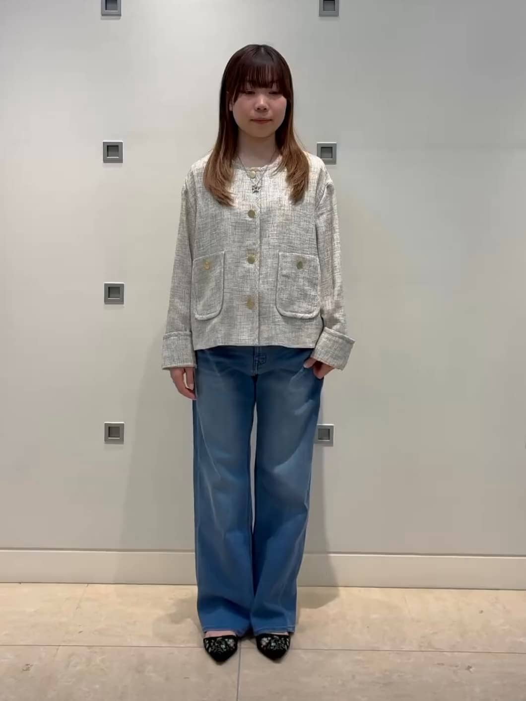 ツイード調の生地でありながらカーディガン感覚でさらっと羽織れるジャケット。明るいデニムと合わせて春らしいキレイめカジュアルなコーデ。62FFJ124 2/① キナリ54BFP521 1/① ブルー