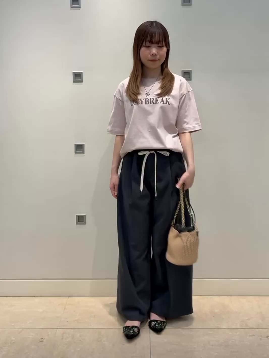 春らしいニュアンスカラーのロゴTシャツとトレンド感のあるワイドパンツでカジュアルなスタイル。