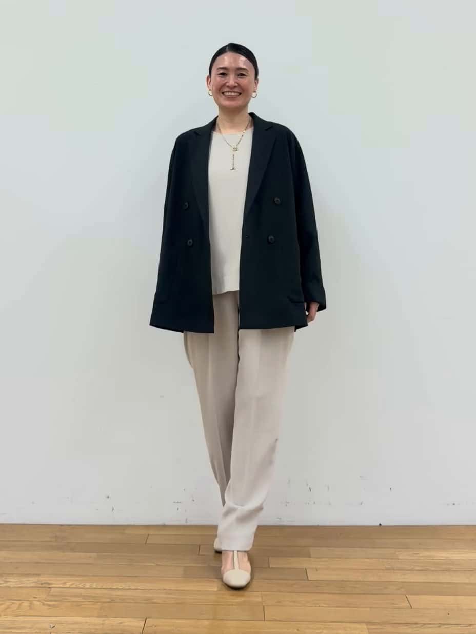 インナーには、快適さを追求したベージュのセットアップをセレクト。155cmの私が着ても、テーパードパンツのラインが美しく、ジャケットを羽織った際もウエスト周りがもたつかずスッキリまとまります。接触冷感やUVカット機能があるため、春夏のオフィスシーンでも一日中快適に過ごせます。