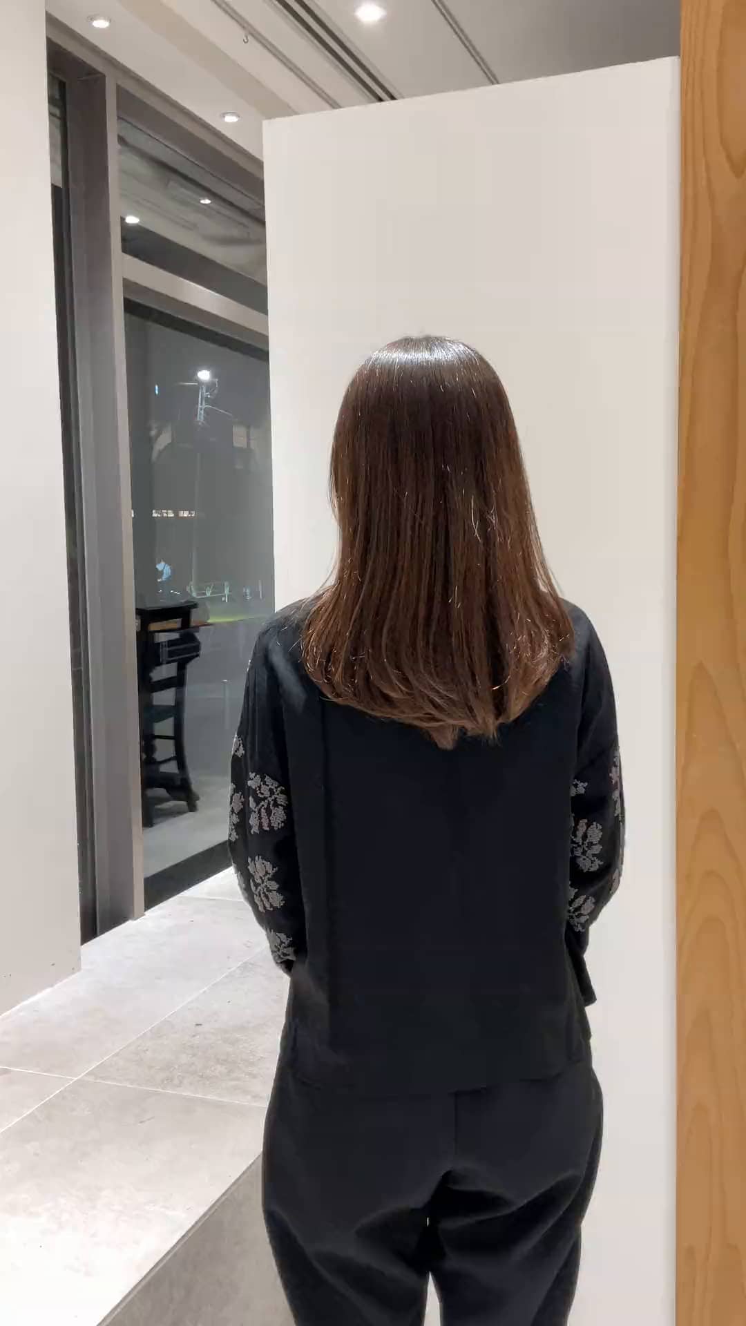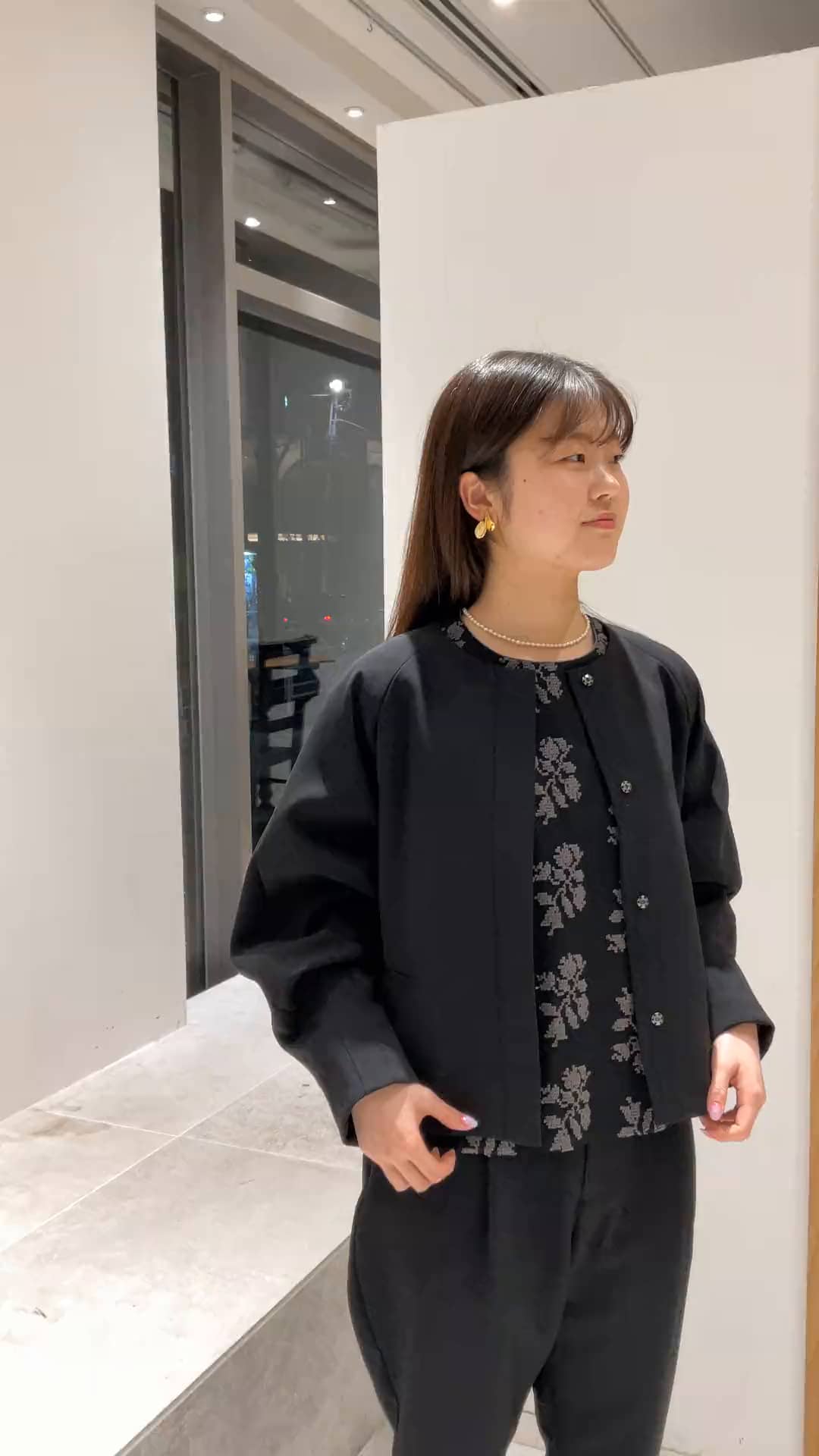 セレモニーのイメージでコーディネートしました。同素材のセットアップで。ブラウスがアクセントになるので、控えめなアクセサリーで充分です。