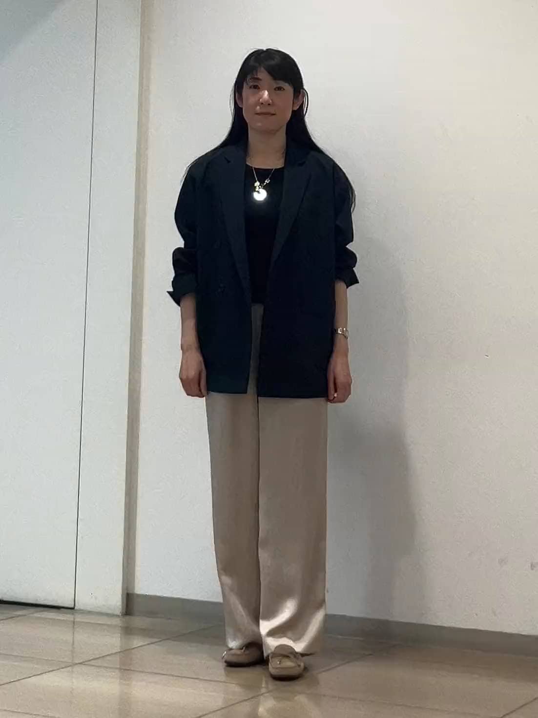 こちらもリアルバイしたお気に入りのパンツです。サテン特有のテカテカ感が抑えられているので、デイリーに使いやすいです。159cmで1サイズを選びましたが、スニーカーでもヒールでもバランスが取りやすい丈感。ウエストゴムで楽ちんなのに、きちんと見えも叶います。