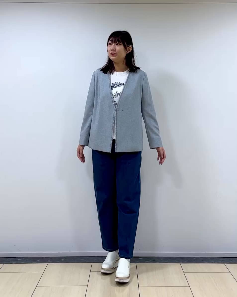 着用感:前見頃のフリンジでフェミニンな印象がありつつノーカラーのミニマルなジャケット。着丈はウエスト位置なので、カットソーやワンピースの上に羽織るなど着回し力抜群です。