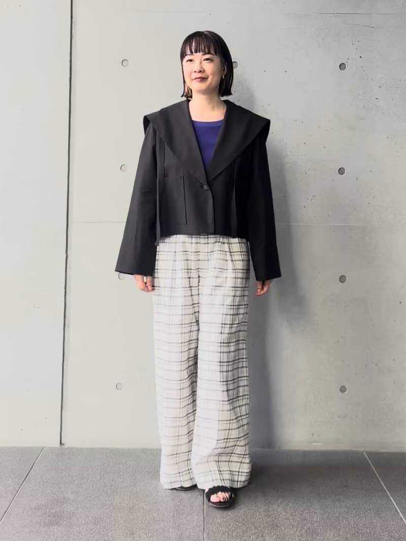 ジャケットのクロップド丈とパンツのフルレングス丈のバランスが、161cmの私でも驚くほど脚長効果を生み出してくれて、今年らしいスタイリッシュな着こなしが完成するので本当におすすめです!