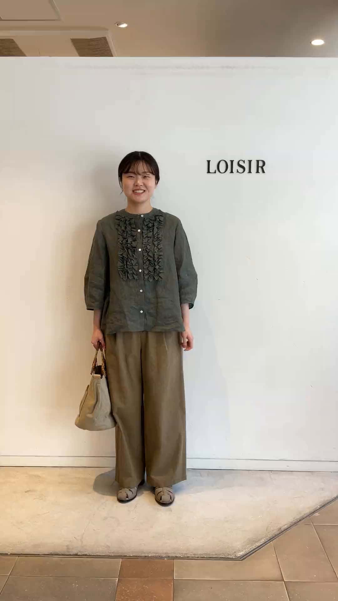 アースカラーコーデ🪴ブラウスのグリーンが引き立つように小物もワントーンで。アウターを着てもタックインしてもフリルがアクセントになります!