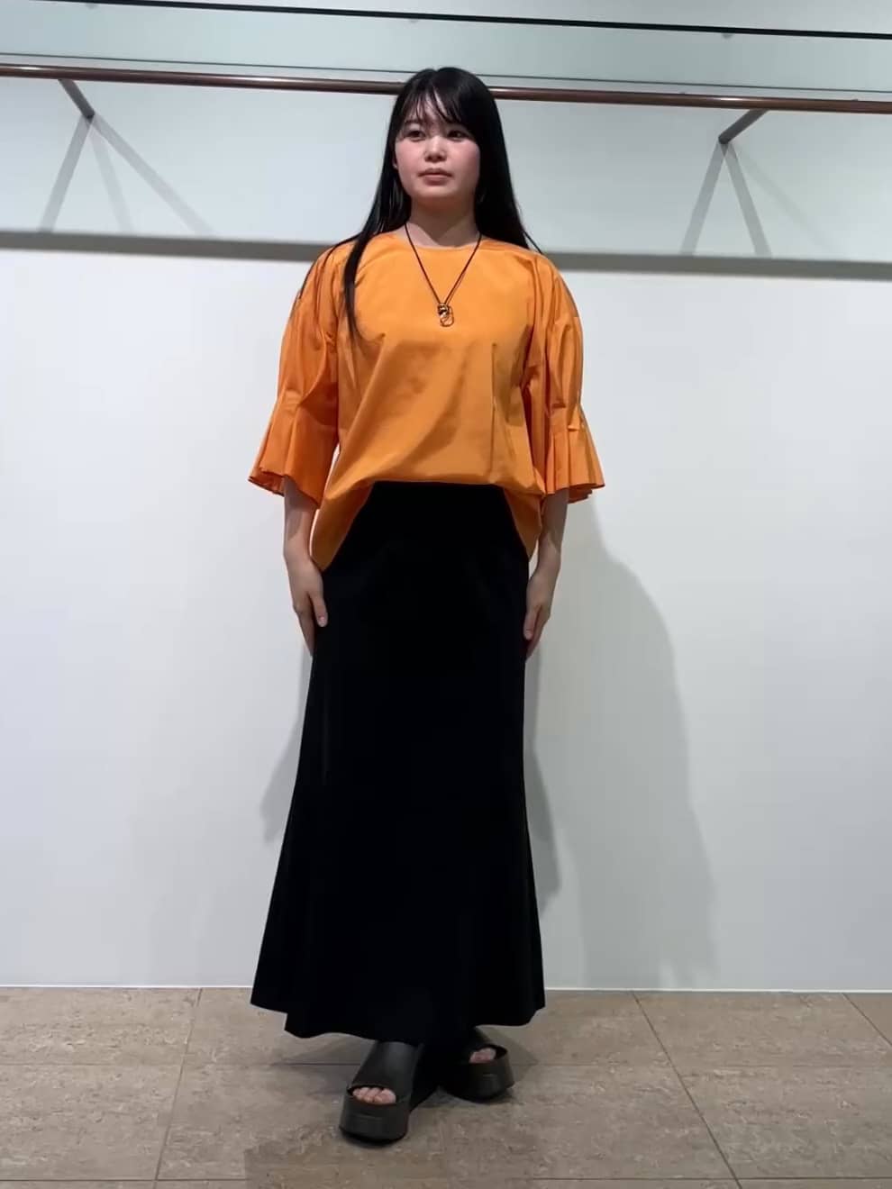 鮮やかなオレンジのブラウス。袖に分量たっぷりのタックが入っていて可愛いです。スカートは体のラインを拾わずに綺麗なシルエットでスタイルアップします。62BFB009 2/② オレンジ62BUS240 2/② ブラック62BEZ440 ② ゴールド