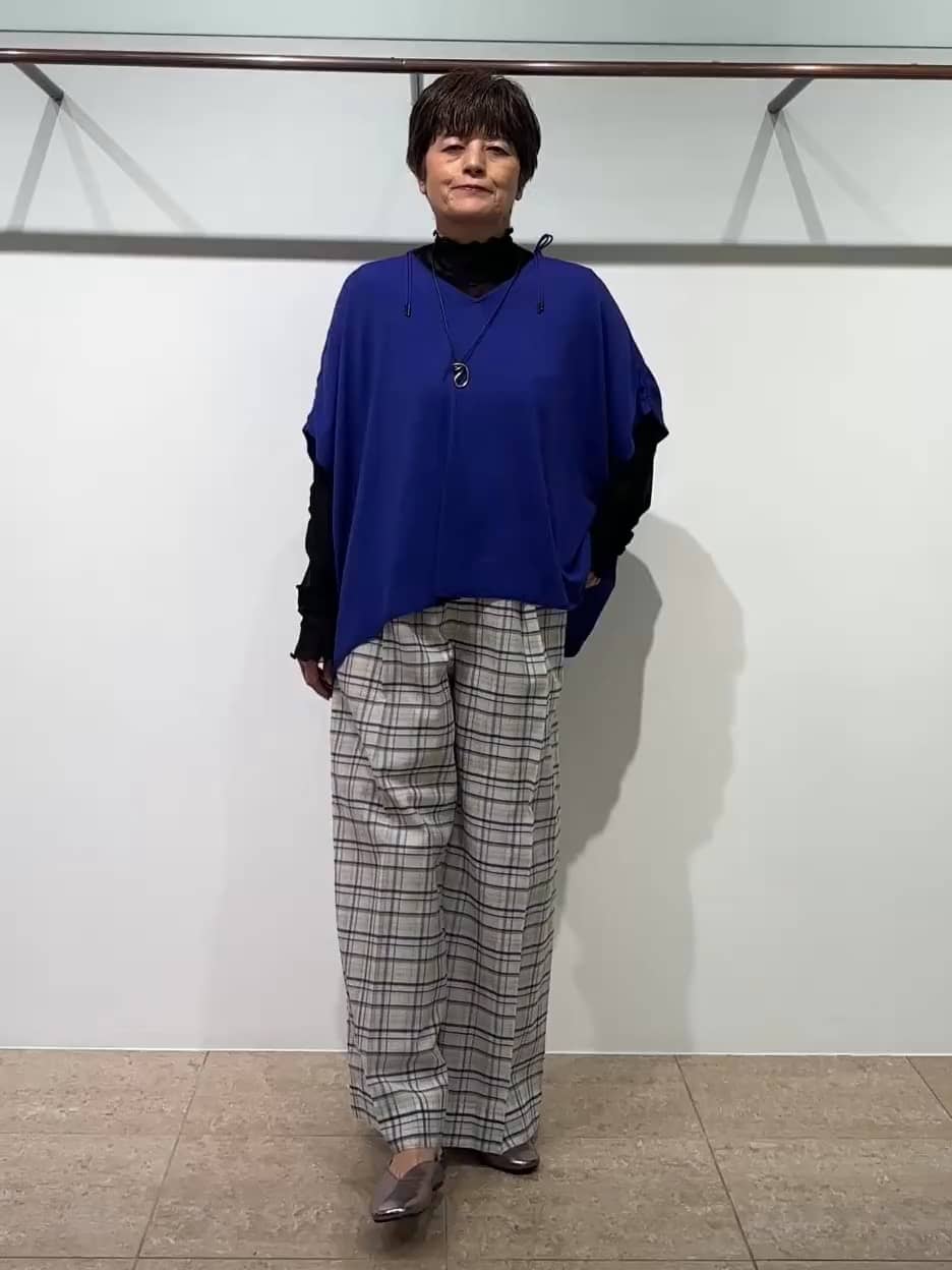 サラッとした落ち感が綺麗なニット。肩のギャザーが調節できるのでアレンジ可能です。ワイドパンツと合わせると可愛いので、チェックのシアー感のあるパンツと合わせました。