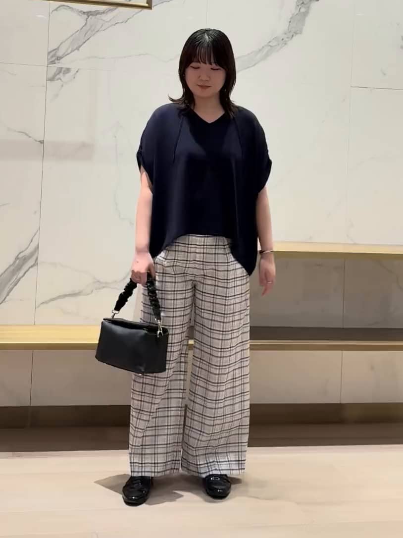 チェックの線にネイビーが入っていますので、トップスのネイビーと色合わせがピッタリです。