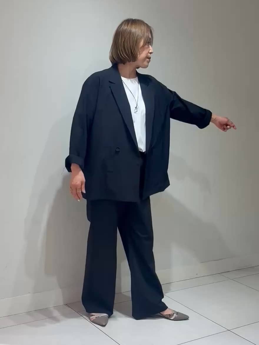膝位置を高めに設定したストレートラインで脚長効果抜群!リラックス感がありながらもラフになりすぎない、絶妙な大人見えシルエットが完成します。