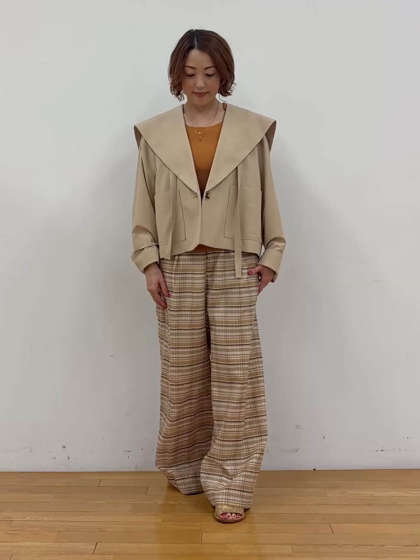 ■ コットンシルクチェックパンツ(ベージュ系・2サイズ着用)