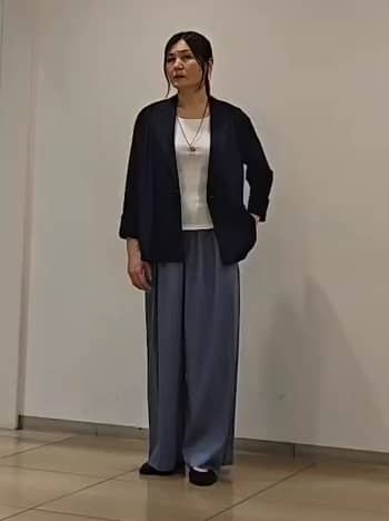 UVカット・撥水など夏に嬉しい機能が満載。驚くほど軽くてドライな質感なので、170cmの私が羽織っても重たく見えず、さらっとノンストレスな着心地です。単品使いしやすく、ネイビーが全体の印象をキリッと引き締めてくれます。