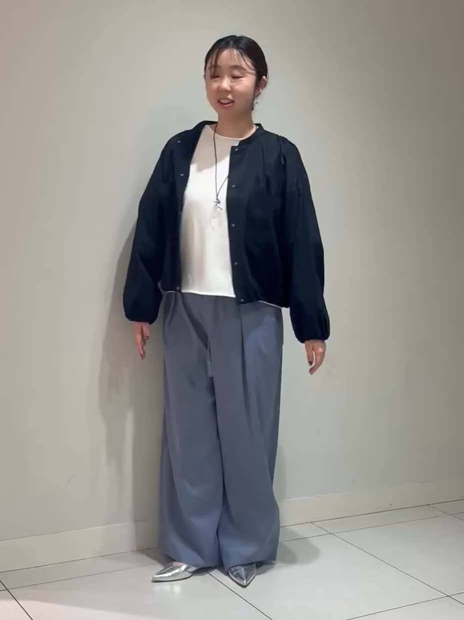 シルクのような光沢とブラウス級の軽さが魅力。ブラックでも重たく見えず、袖や裾のギャザーのふんわりとしたフォルムが女性らしい抜け感を引き立ててくれます。