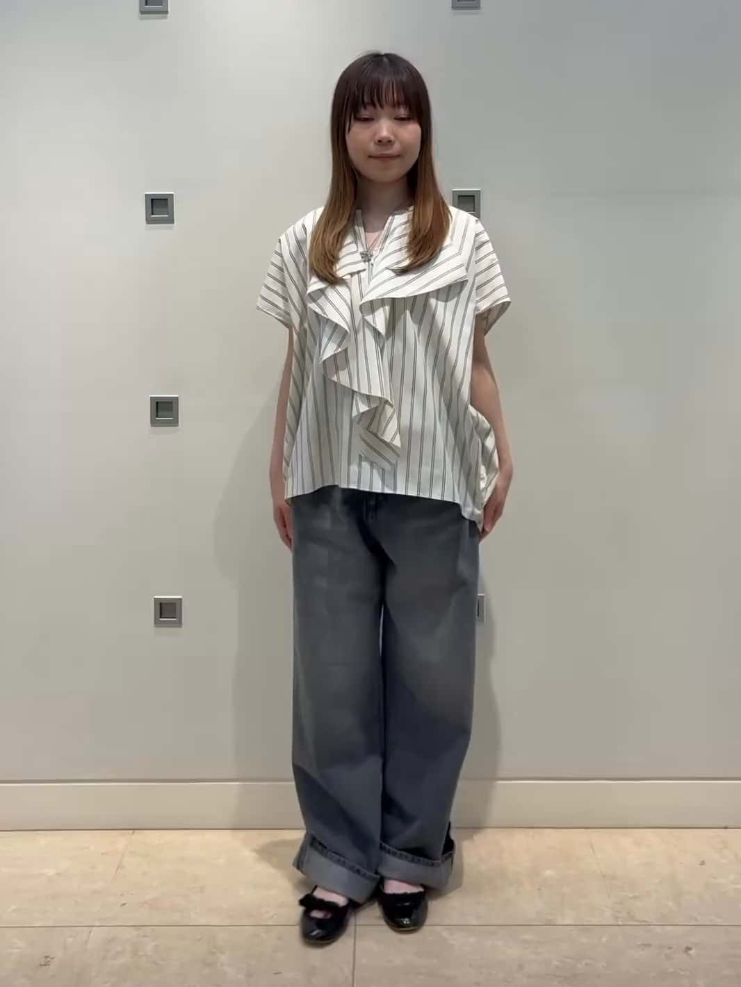 カスケードフリルが特徴のストライプブラウス。動きのあるカッティングがおしゃれな一枚です。デニムパンツと合わせてキレイめカジュアルなスタイルに。62BFB010 2/① オフ62FFP191 1/② グレー