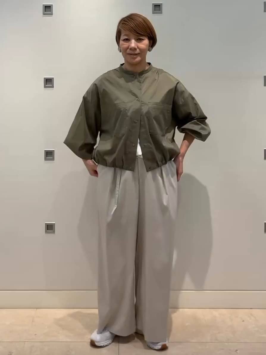 着丈の短いブルゾンはボリュームパンツと合わせて今年らしいスタイリングに。