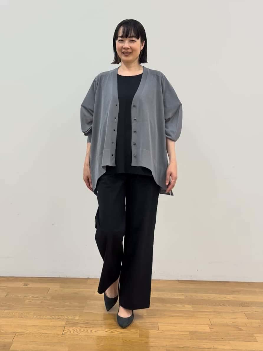 スーピマ綿とシルクをブレンドした、驚くほど滑らかでしなやかな肌触りです。161cmの私が2サイズを羽織ると、大きく落としたラグランスリーブが体に馴染み、美しい落ち感を作ってくれます。サテンのくるみボタンが、さりげないポイントになります。