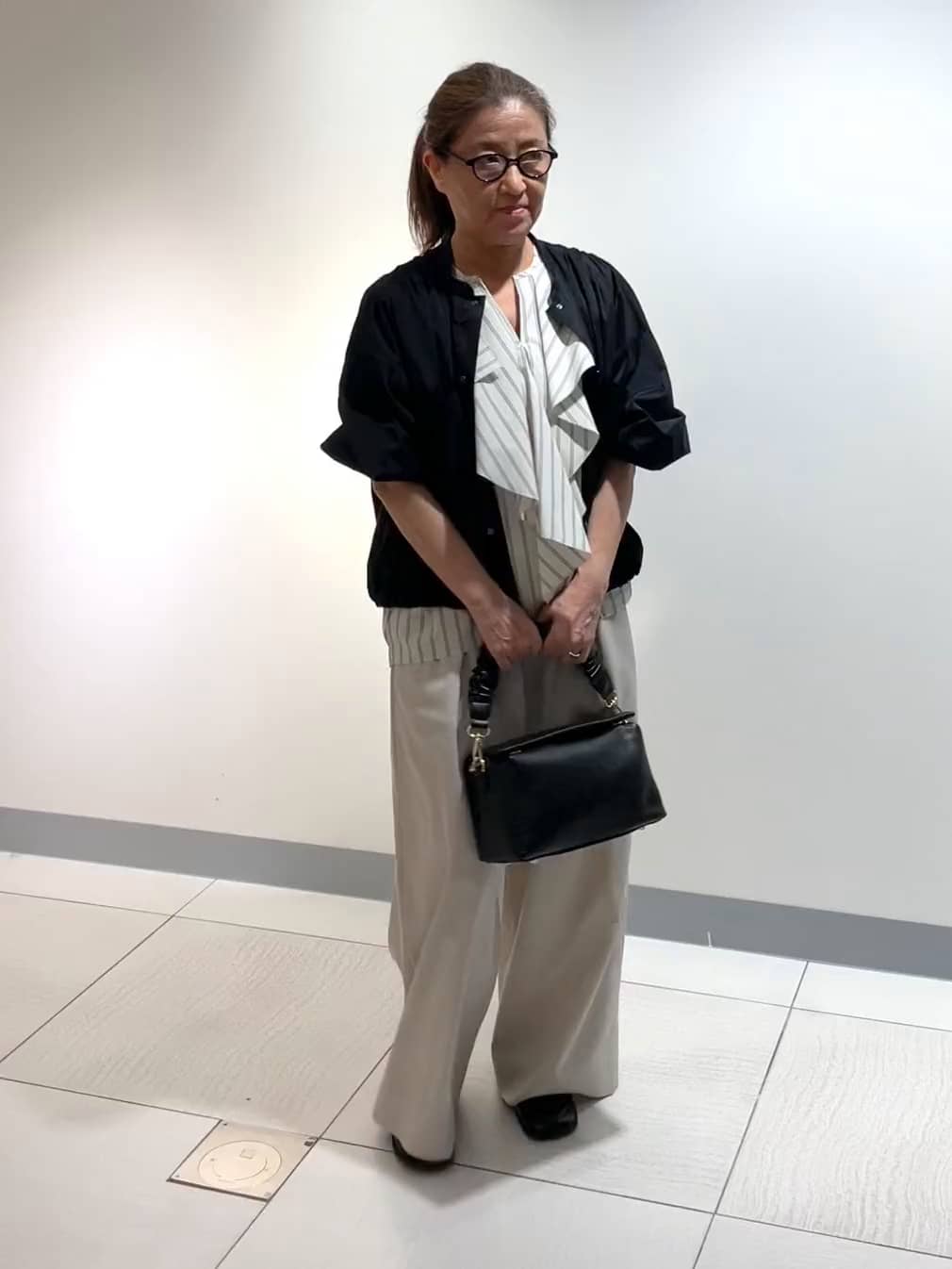 驚くほど軽くサラッとした質感で、暑い日も快適に過ごせるワイドパンツ。157cmで2サイズを穿くと、フラットシューズで少し長めの裾に溜まる丈感です。