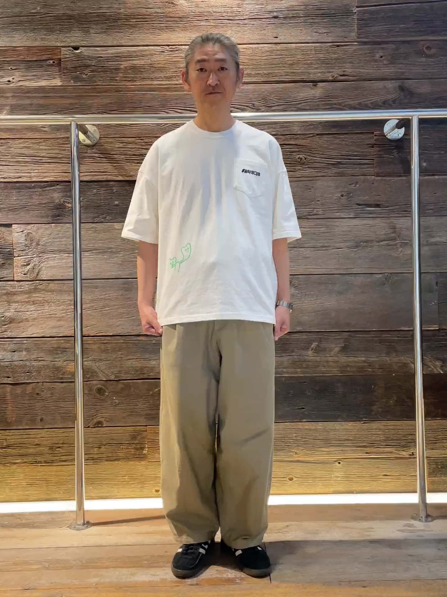 着用感 : 台湾出身のアーティスト「Bear Yan」のコミカル&シュールなイラストがプリントされたコラボレーションアイテム。ホワイトボディに、ネオンカラーのプリントが映えるデザインで、シンプルな着こなしでもアクセントになる一枚です。