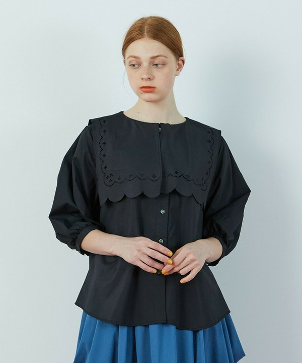 セーラーカラー風の大き目な衿がかわいらしい雰囲気ぼブラウスは、ブラックをチョイスすれば大人っぽく着て頂けます。
