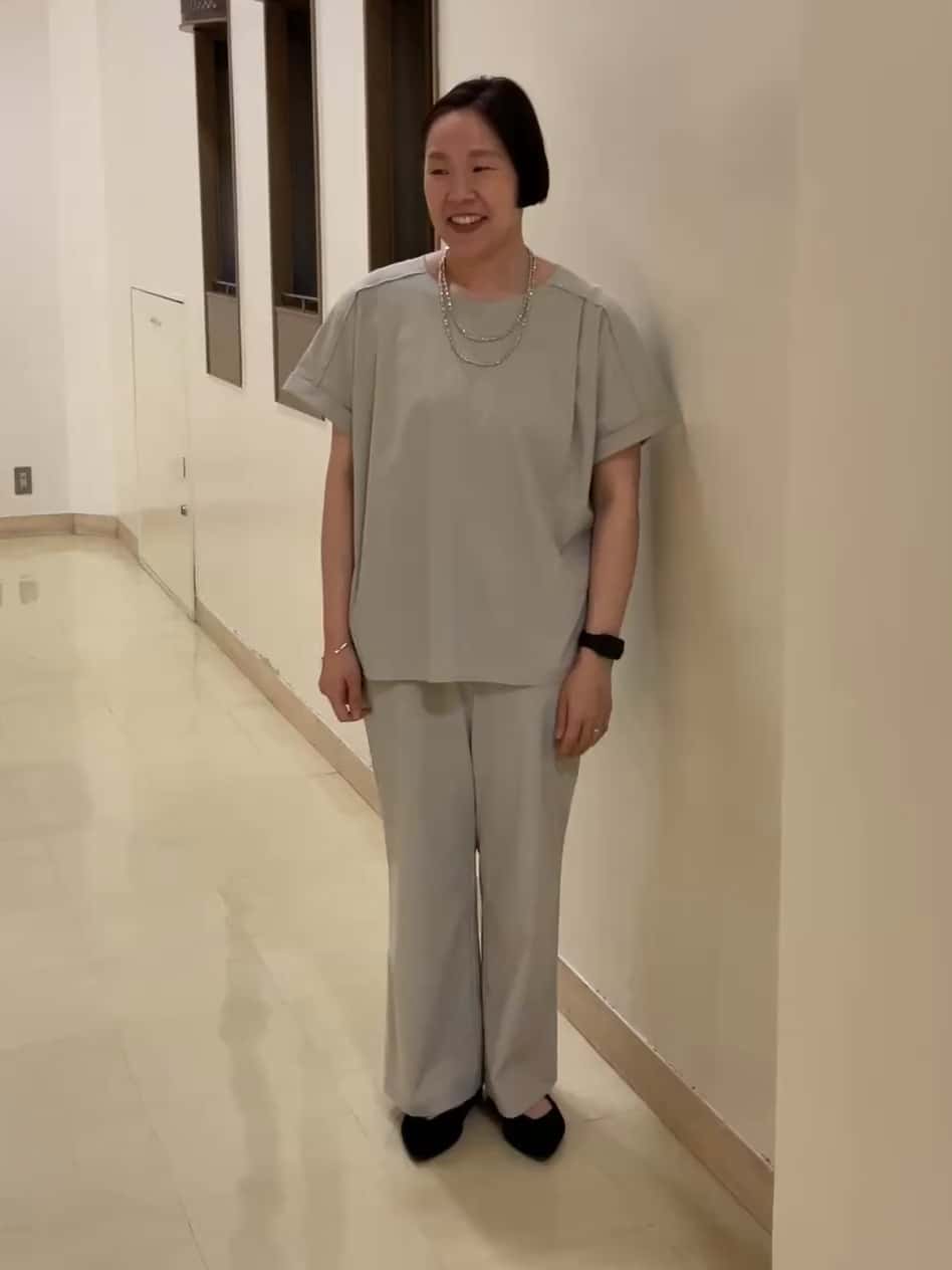 160cmの私でくるぶしが隠れるくらいの丈感です。脇のタックがポイントのイージーパンツ。少し高めの膝位置でラインを入れた、すっきりとしたストレートシルエットがスタイルアップを叶えてくれます。ウエストはゴム仕様で、長時間の座り移動も楽ちん!トップスと同じ機能素材を使用しているので、穿き心地はとっても快適です。